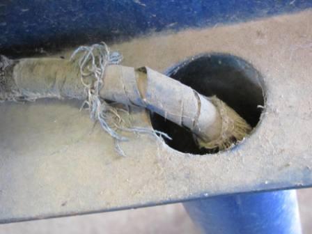 Aquí está una foto de una “ex─jabalina” metida en un pozo con capas de aditivos incluyendo la de carbón. La capa de carbón es muy evidente: se comió el acero. Perdió la mitad de su masa.