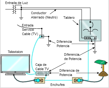 Cuando una descarga atmosférica cae cerca (o sobre) de uno de estos servicios, va a inducir un voltaje o potencia en tal servicio con respecto a los demás servicios. La diferencia de voltajes instantáneamente entre un servicio y otros puede ser miles de voltios. En la imagen se puede imaginar que hay varios servicios adicionales, especialmente en oficinas de comercio y/o administración pública.