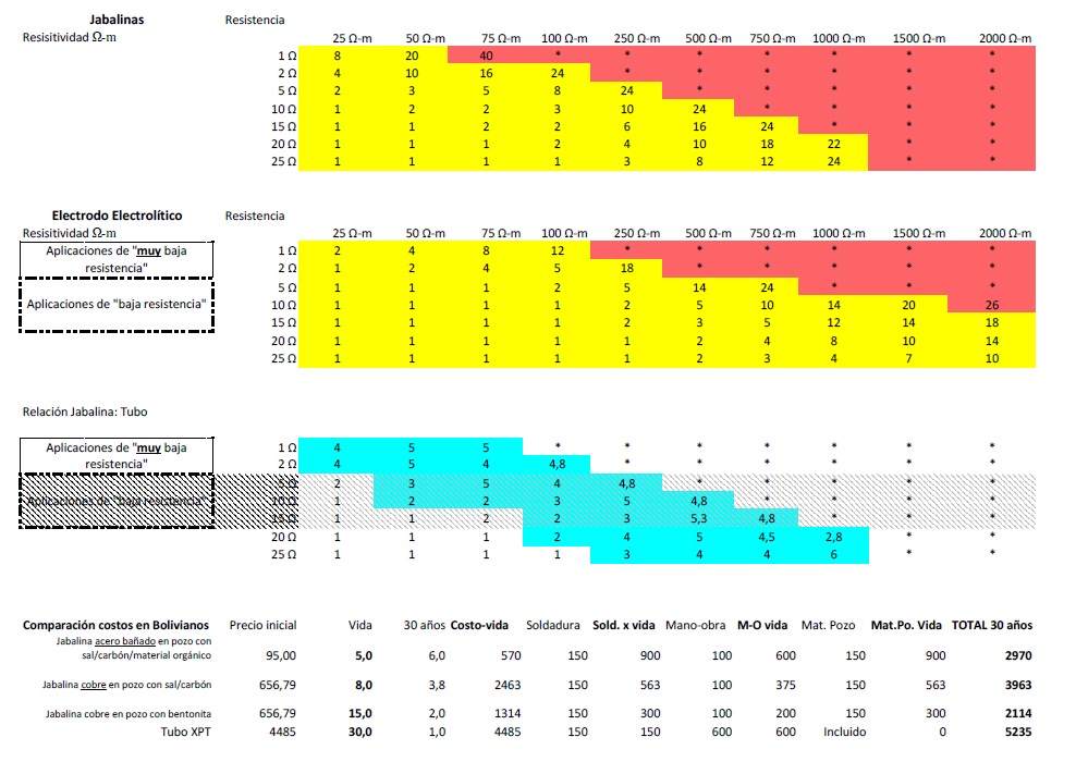 d) Unos cálculos de la relación de costos de 1) jabalinas de acero bañado en cobre colcadas en pozos con sal/carbón/material orgánico con una vida de 5 años; 2) jabalinas de cobre colocadas en los mismos pozos envenenados con sal + carbón + material orgánico con una vida prevista de 8 años; 3) jabalinas de cobre colocadas en pozos con bentonita «normal» con una vida útil de 15 años; 4) electrodos electrolíticos XPT de Lyncole colocados en Lynconite II, una formulación especial de bentonita más aditivos para proteger el cobre, bajar la resistencia y mantener la humedad del Lynconite II a largo plazo. Los cálculos de costos estan en Bolivianos, aproximadamente 7 Bolivianos / $ (USD)