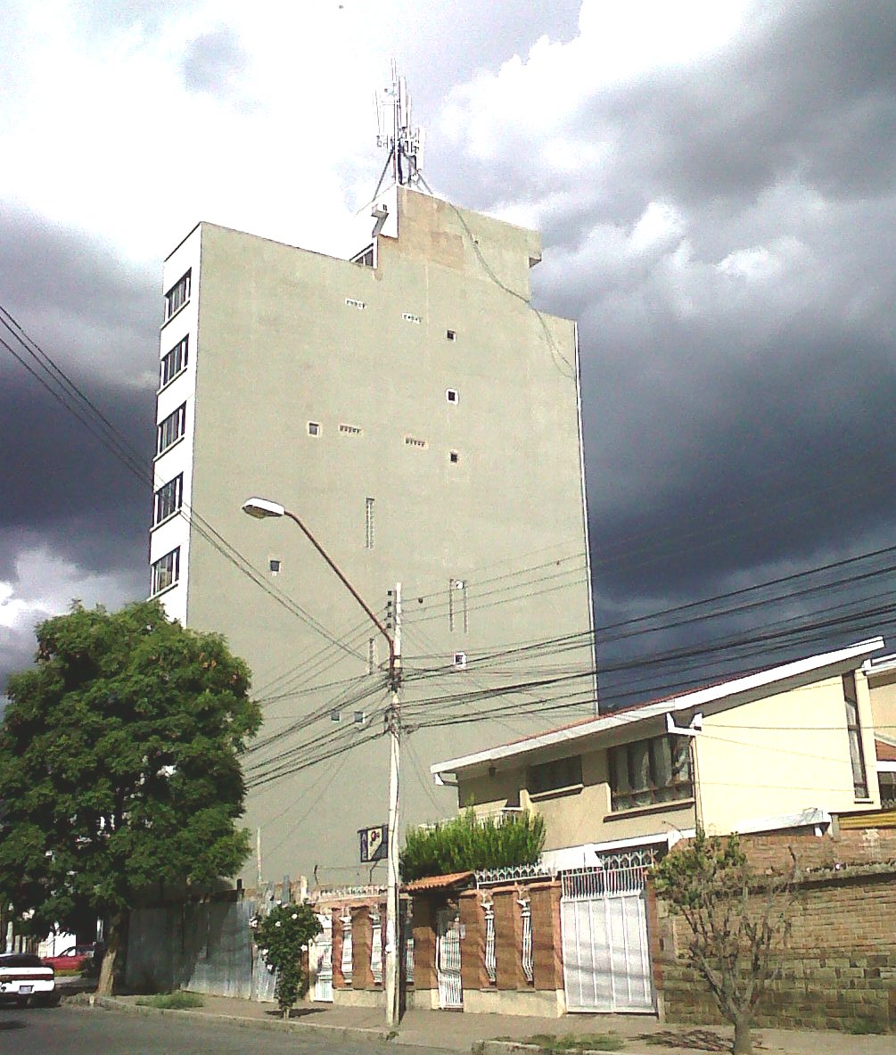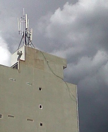 En la foto se puede ver un problema común en mucho del mundo: una torre encima de un edificio con un solo conductor bajante.