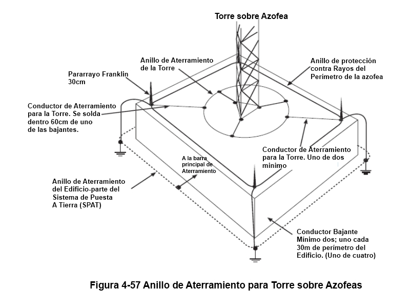 3) La Motorola R-56 exiga un anillo de protección en el perímetro de la azotea con pararrayos cada 6m o un mínimo de cada esquina de la azotea.