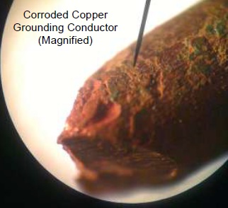 Interpretación: Cobre es un elemento noble que resiste corrosión. Hay factores que contribuyen a la corrosión. Los puntos #5 & #8 hablan de las amenazas de material orgánico alrededor de la jabalina. El uso de material orgánico en pozos de puesta a tierra es común en mucho de América Latina. En punto #6 habla de cenizas húmedas & partículas de carbón. Hay muchos que vierten carbón vegetal y cenizas en el pozo de puesta a tierra. Estas practicas contribuyen a la corrosión de cobre / acero bañado en cobre. Nuestra recomendación de Lyncole es que nunca debe verter material orgánica, carbón ni ceniza en el pozo de aterramiento.