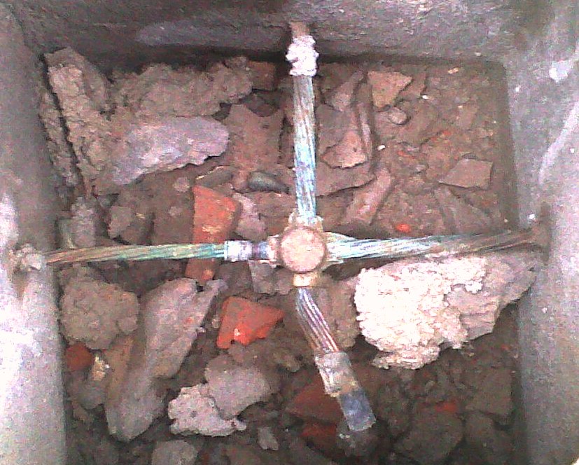 Otra obra que ¡no es nuestra! Está ubicada en una instalación muy importante donde la seguridad del público depende del sistema de puesta a tierra. Unos 30cm más a la izquierda hay otra jabalina en paralelo. Por el color de la oxidación parece que la jabalina (o «ex-jabalina») es de acero. No sabemos si era de acero bañado en cobre o no. Supuestamente la jabalina fue enterrada hace solamente cinco años. El técnico de la empresa haló la jabalina y se rompió de forma inesperada.