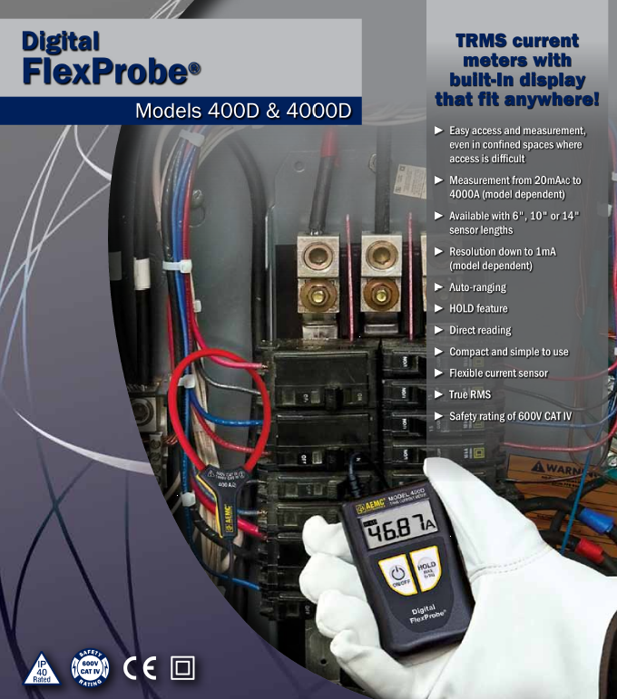 Es un axioma de ingeniería y mantenimiento: si no se puede medir, no lo puede controlar. Entonces es importante tener en su «caja de herramientas» varios instrumentos de medición. El medir la corriente es fácil cuando se puede meter una pinza. Sin embargo cuando su trabajo incluye medir un cable dentro un espacio estrecho (ejem: dentro un tablero) no se puede meter un amperímetro tipo pinza. Hay otros tipos de amperímetros que usan un bucle de alambre (especial) delgado y flexible. Los modelos AEMC 400D y 4000D son para tales mediciones.