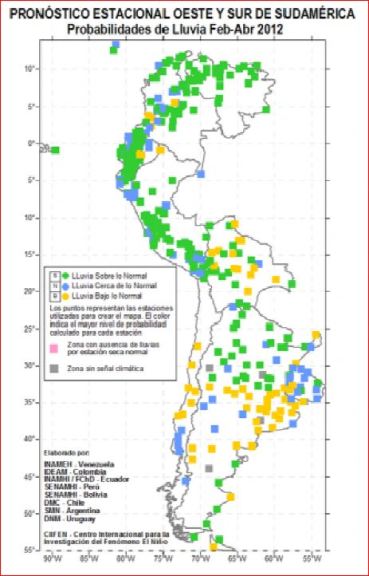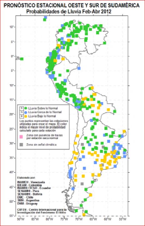 Hay un buen recurso sobre meteorología de medio plazo (meses) para todo la región de América Latina. Se encuentra en Centro Internacional para la Investigación del Fenómeno de El Niño (CIIFEN). El CIIFEN emite un boletín de aviso cada mes. El boletín para marzo 2012 se encuentra aquí.