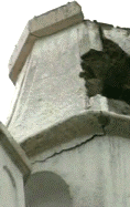 Se puede ver que todo de la parte superior se ha volado. Hay fisuras grandes que indican daños a la estructura. Por suerte no se cayó más de la torre. En el video se ve algo de lo qué cayó al suelo.
