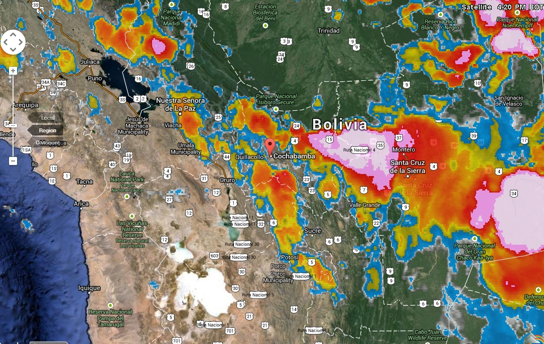 En el enlace Wunderground.com se puede encontrar pronósticos meteorológicos más imagenes del tiempo. Las imagenes son casi en tiempo real para la mayoría del planeta habitado. Abajo está la imagen por satélite a las 1620 horas –> parece que hay una tormenta en el trópico del Dpto. de Cochabamba..